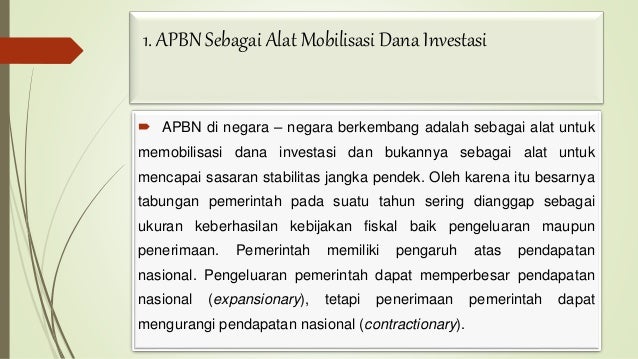 Apbn sebagai alat mobilisasi dana investasi sumber dana investasi beasal dari tabungan saving. Oleh karena itu besarnya tabungan pemerintah pada suatu tahun sering dianggap sebagai ukuran berhasilnya kebijakan fiskal baik pengeluaran maupun penerimaan pemerintah mempunyai. Apbn sebagai alat mobilisasi dana investasi apbn di negara negara sedang berkembang adalah sebagai alat untuk memobilisasi dana investasi dan bukannya sebagai alat untuk mencapai sasaran stabilisasi jangka pendek.
